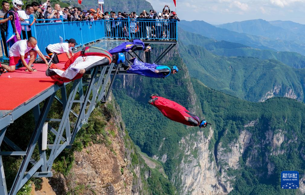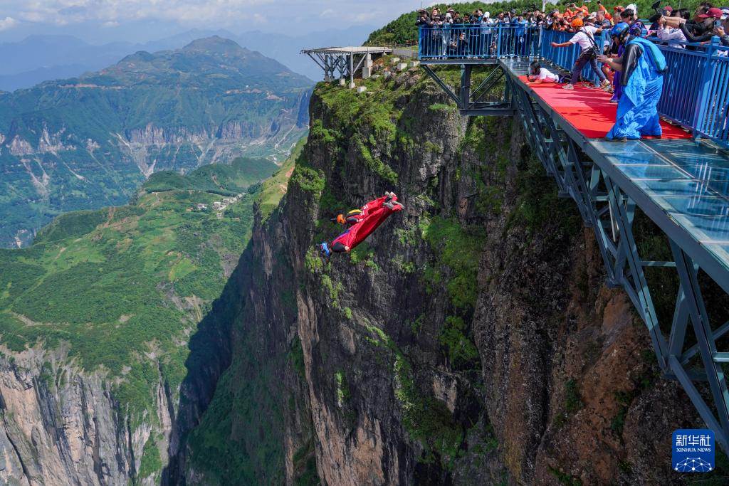 7月19日,翼裝飛行運動員從跳臺躍下。新華社記者 王靜頤 攝