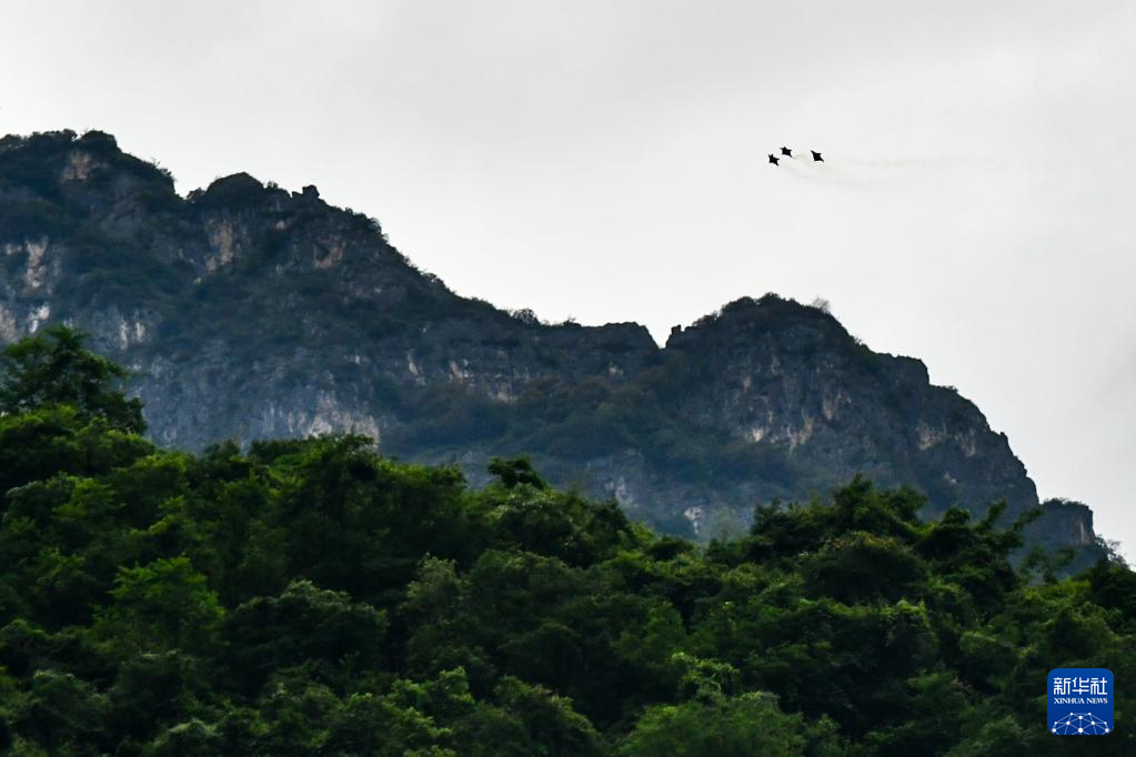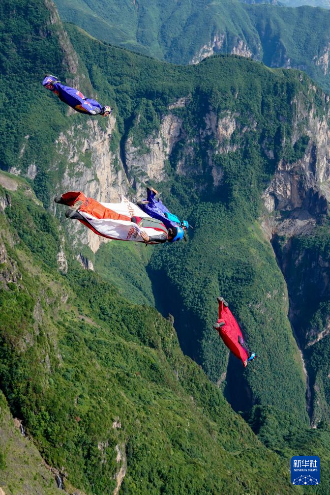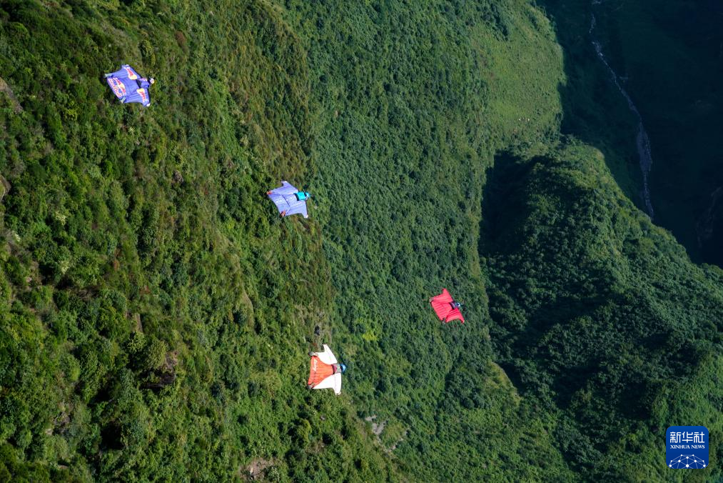 7月20日,翼裝飛行運動員正在大山包(環線)上空飛行。新華社記者 王靜頤 攝