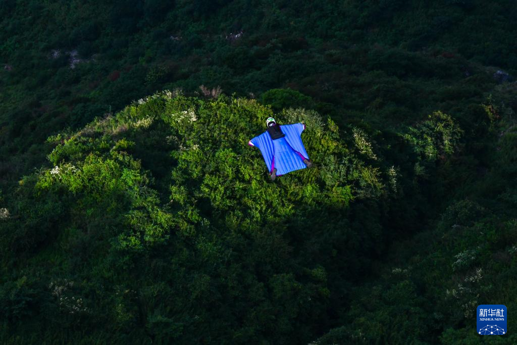 7月20日,一名翼裝飛行運動員準備降落。新華社記者 王靜頤 攝