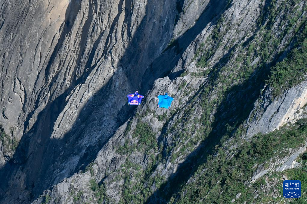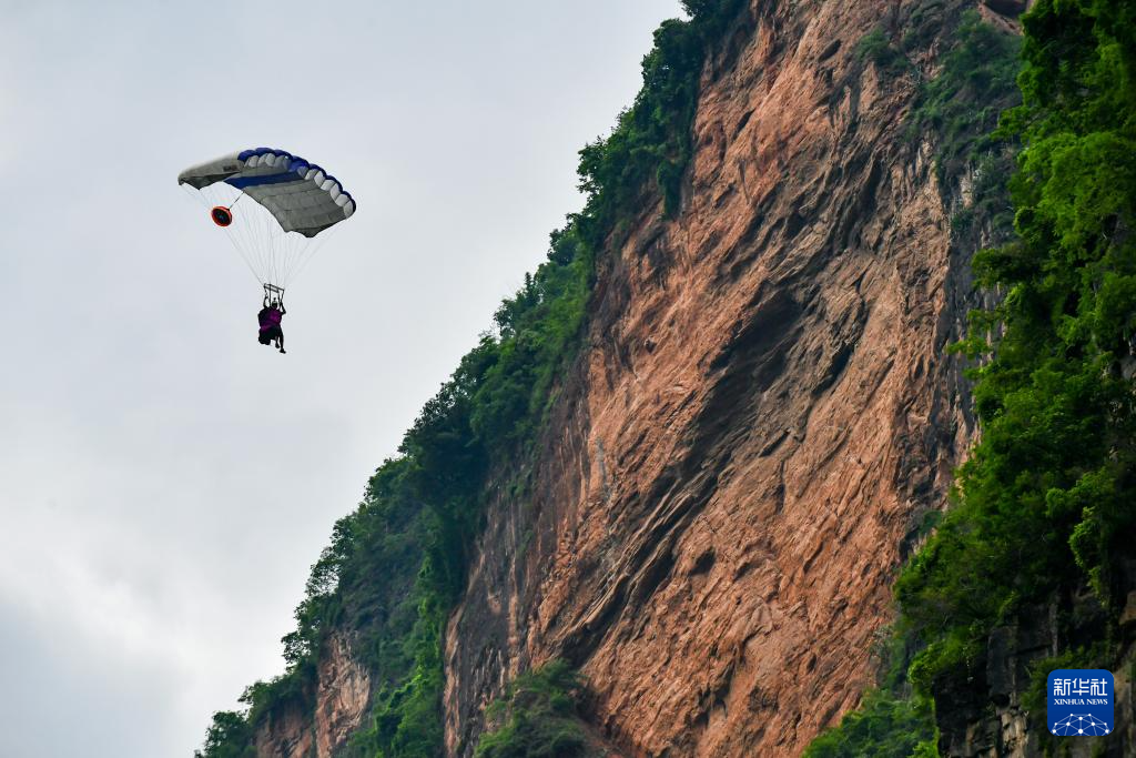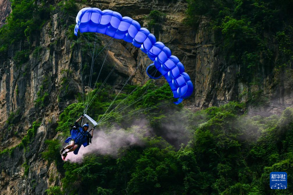 7月19日,翼裝飛行運動員躍入峽谷。新華社記者 王靜頤 攝