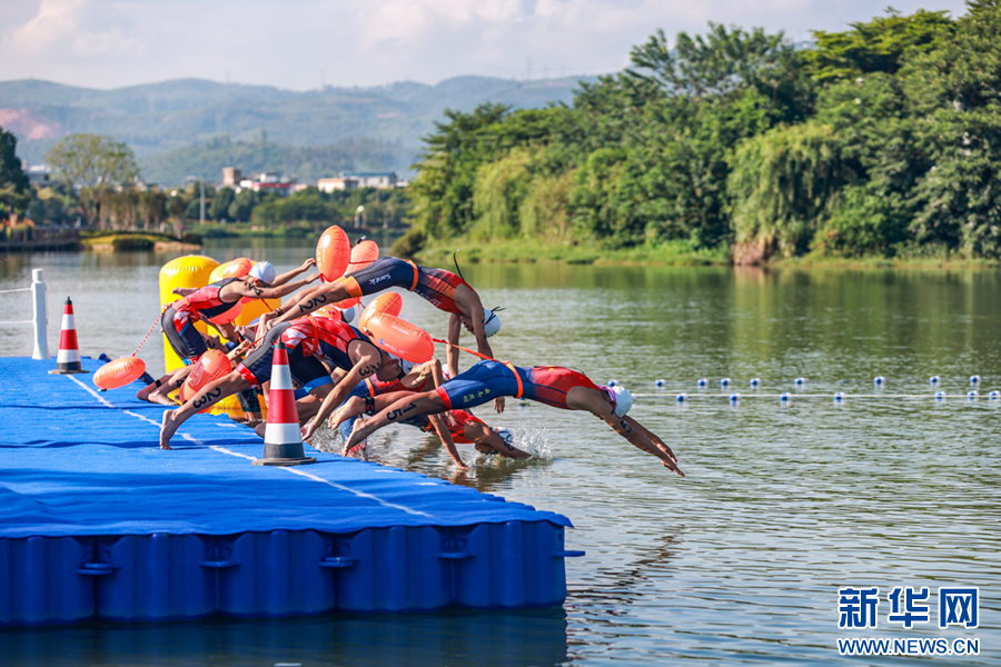 7月24日,云南省第二屆青少年(學生)運動會鐵人三項比賽中,選手躍入水中。新華網發(陶家淇 攝)