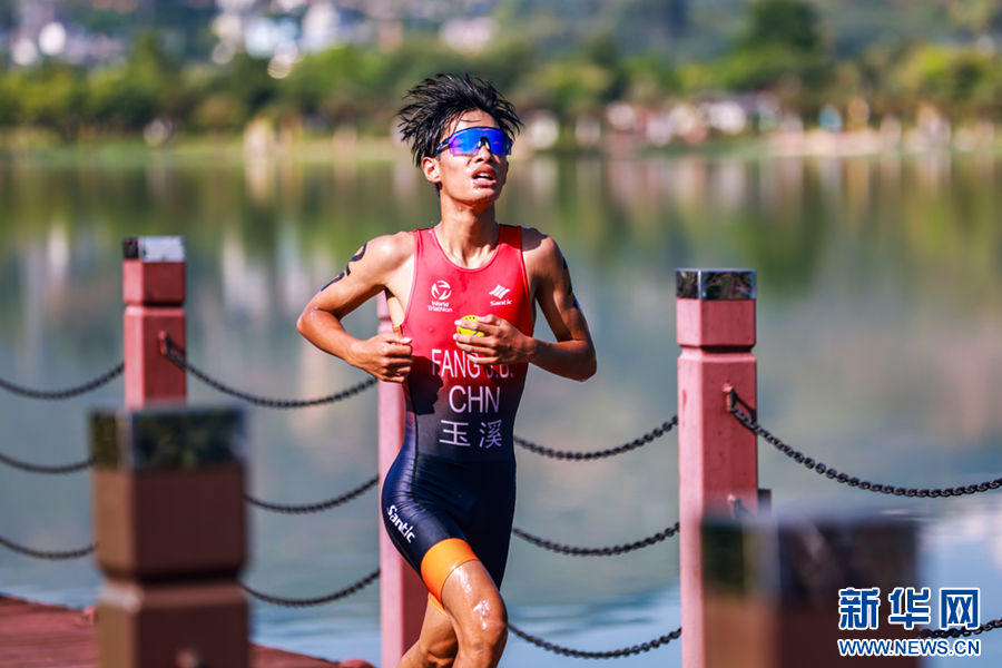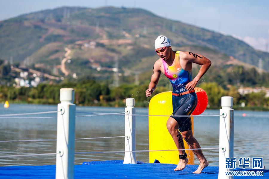 7月24日,云南省第二屆青少年(學生)運動會鐵人三項比賽中,參賽選手結束游泳起水瞬間。新華網發(陶家淇 攝)