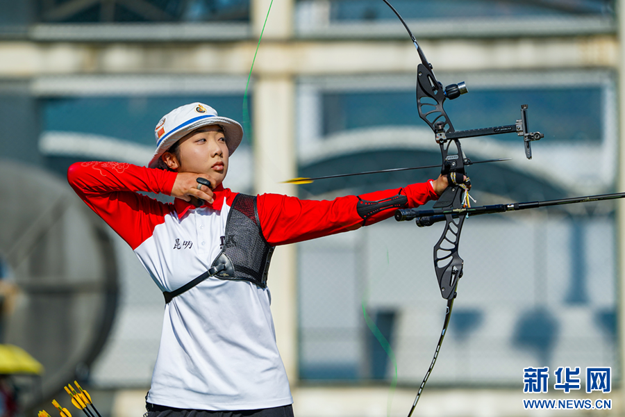 7月26日上午,云南省第二屆青少年(學生)運動會射箭項目女子團體決賽,隊員出箭瞬間。新華網發(陶家淇 攝)