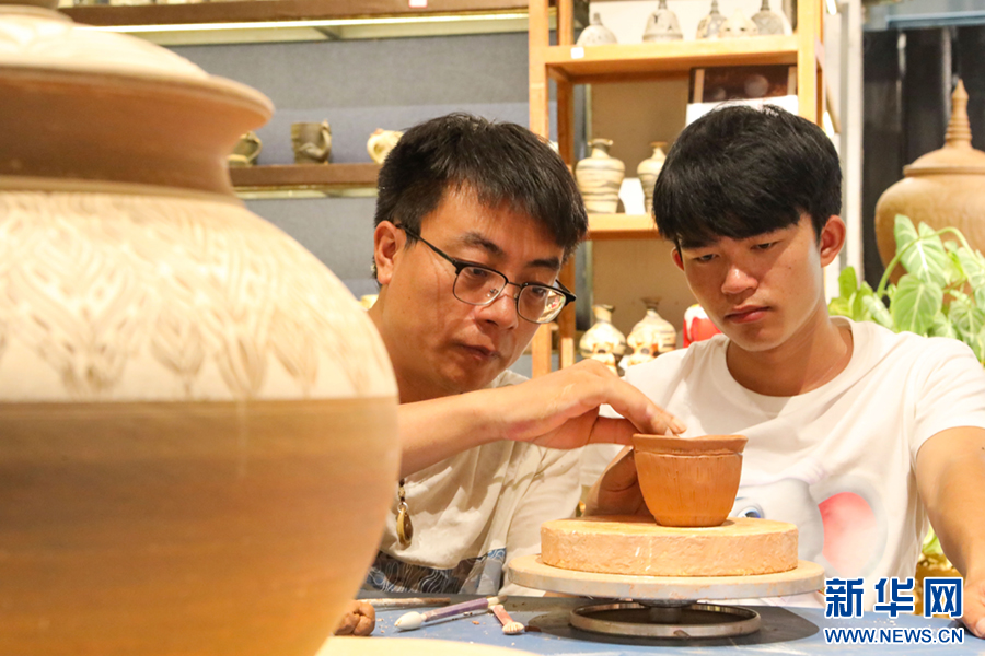 7月28日,學生在云南省西雙版納傣族自治州景洪市一家傣陶廠學習傣族慢輪制陶。