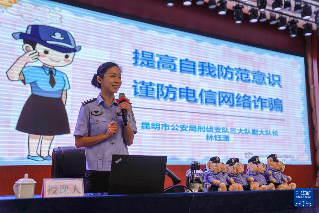 8月2日,昆明市公安局民警林鈺瀟正在為華坪女高學生宣傳反詐知識。新華社記者 彭奕凱 攝