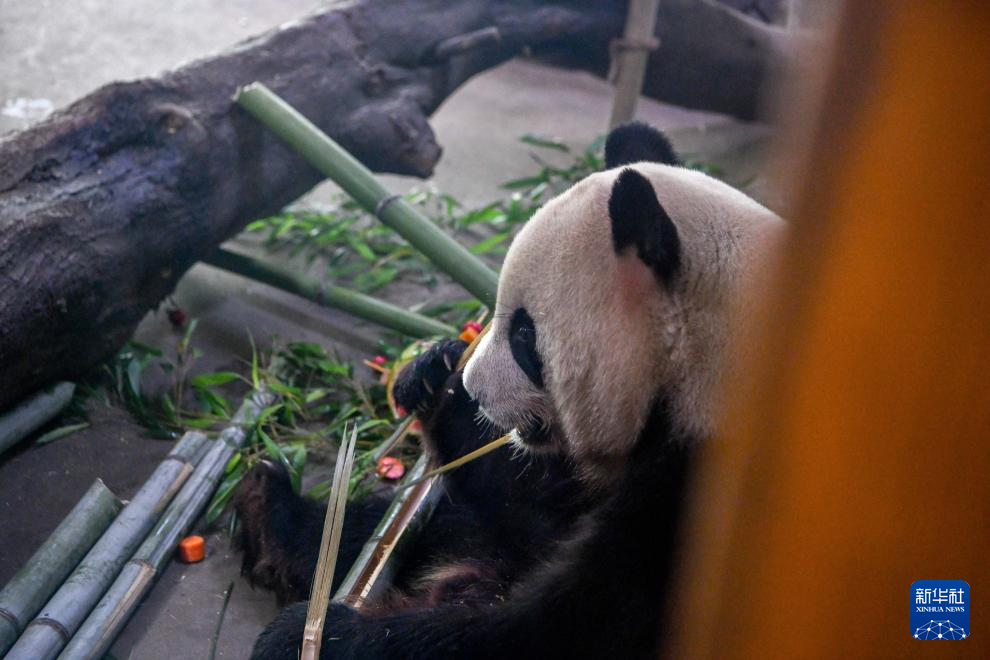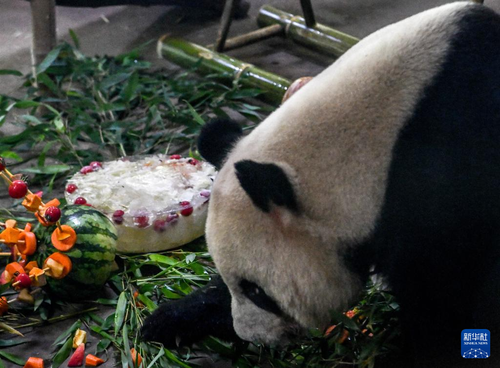 8月2日,大熊貓“珍多”在活動內場吃“生日蛋糕”。新華社發(朱敬熹 攝)