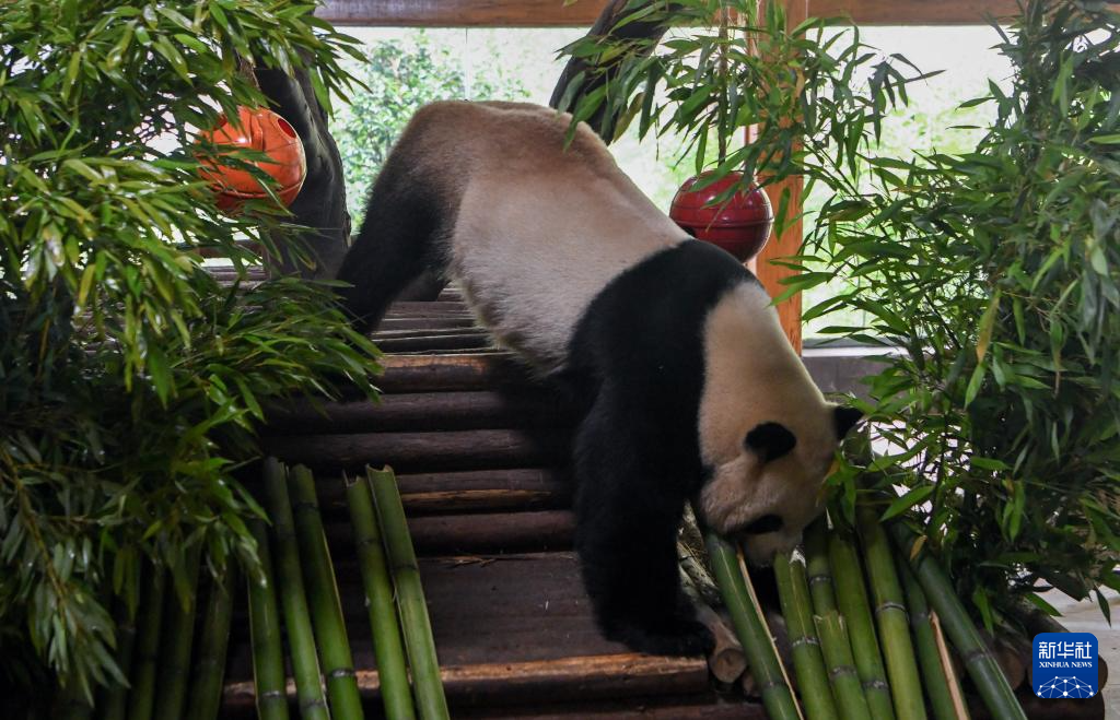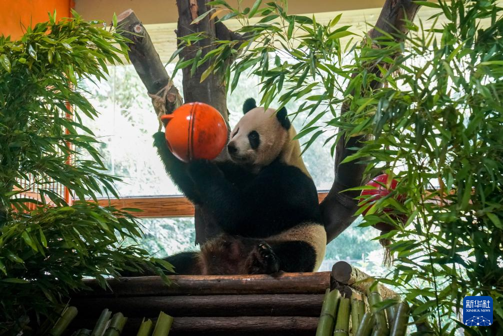 8月2日,大熊貓“珍多”在活動內場玩耍。新華社發(莫欣竹 攝)