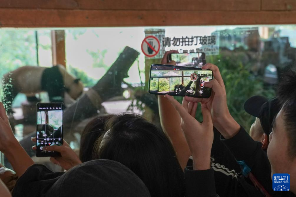 8月2日,現場觀眾紛紛拍攝正在玩耍的大熊貓“珍多”。新華社發(莫欣竹 攝)