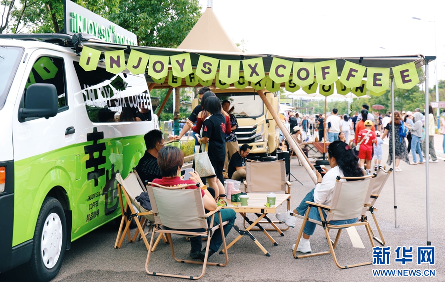 2024滇池東岸國際咖啡文化嘉年華活動現場,市民和游客在一輛咖啡車前品嘗咖啡(攝于8月11日)。