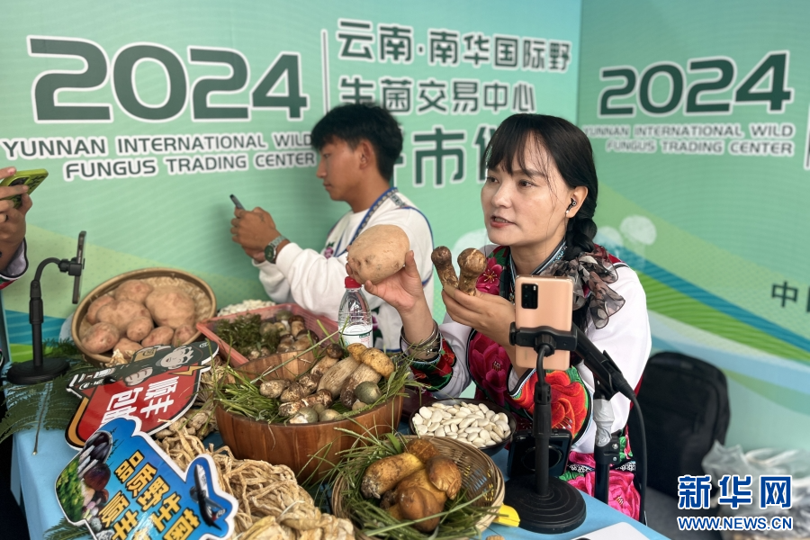 8月8日,云南·南華國際野生菌交易中心開市運營,帶貨主播正在直播銷售野生菌。新華網發(周奕汐 攝)