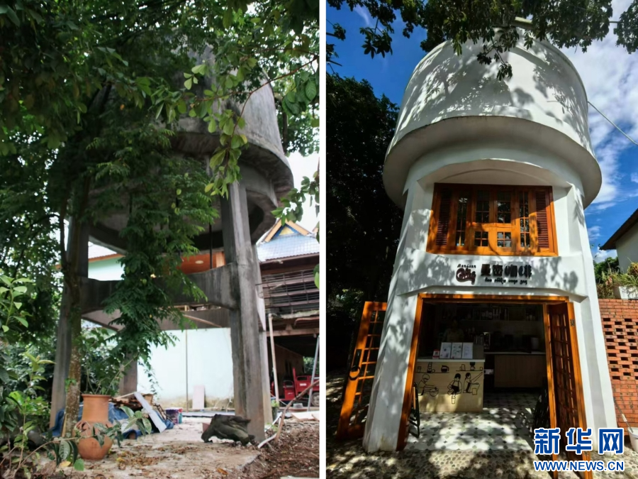 拼版照片:左圖為曾經廢棄的水塔(資料圖);右圖為“三曼”村廢棄水塔改造后的咖啡屋(8月8日攝)。