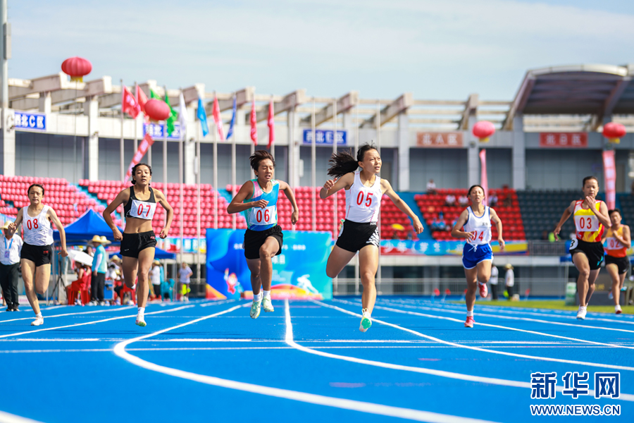 8月13日,田徑項目比賽中,女子組200米選手沖刺通過終點線瞬間。新華網發(陶家淇 攝)