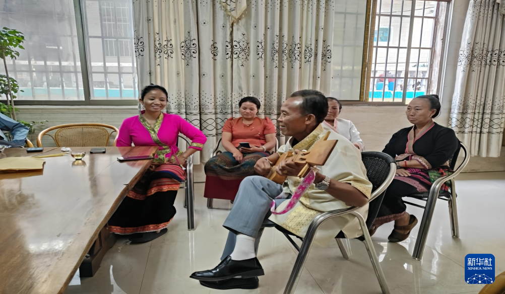 云南省西雙版納傣族自治州勐??h老曼峨村村民巖布南展示布朗族傳統彈唱。(云南省圖書館供圖)
