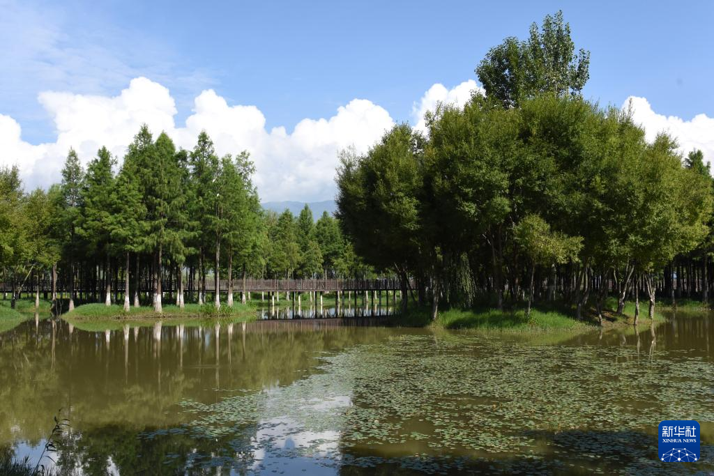 這是8月21日拍攝的茈碧湖彌茨河入湖口處的濕地公園。新華社記者 劉思遠 攝