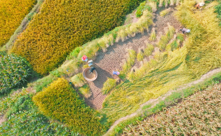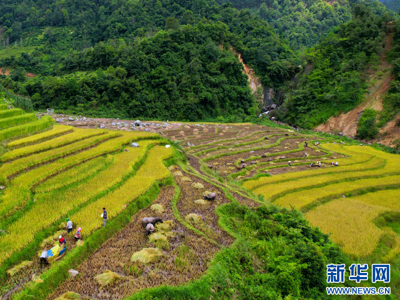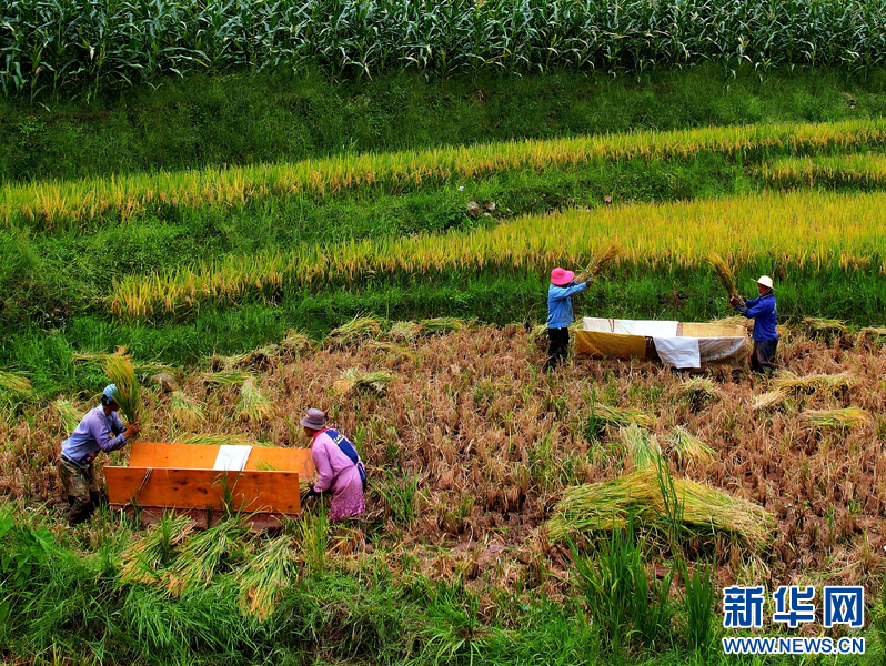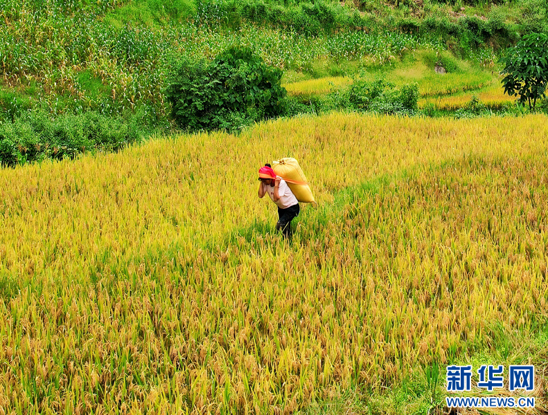 初秋,云南省普洱市墨江哈尼族自治縣那哈鄉阡陌交錯的稻田里,一株株稻谷連成黃綠相間的海洋,金黃色的稻穗在微風中泛起稻浪,村民們正搶抓晴好天氣,開鐮收割、脫粒、裝袋,一派忙碌景象,處處洋溢著豐收的喜悅。(完)(王瑋怡)
