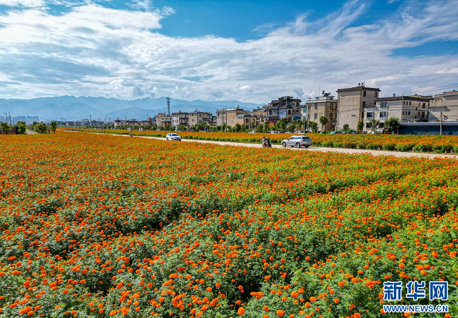 河圖街道兩旁的萬壽菊(8月16日攝)。新華網發(郭康 攝)