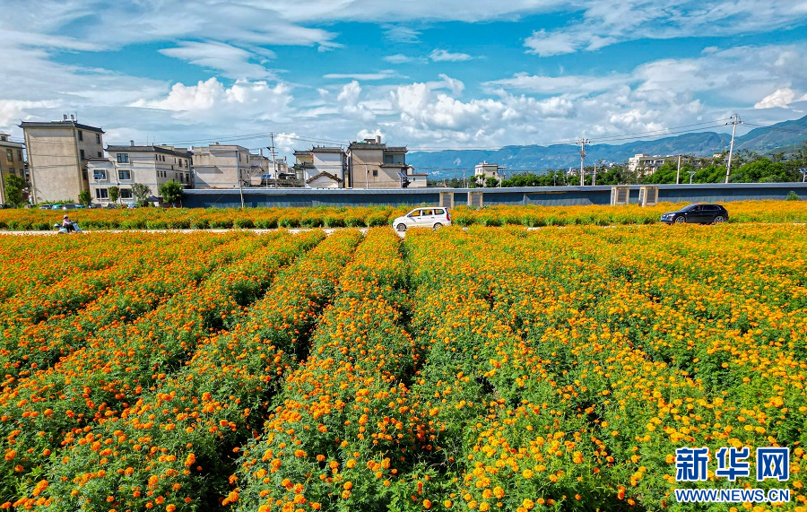 近日,在云南省保山市隆陽區河圖街道,金黃色的萬壽菊競相綻放,將整個河圖壩子裝扮得多姿多彩。(完)(郭康)