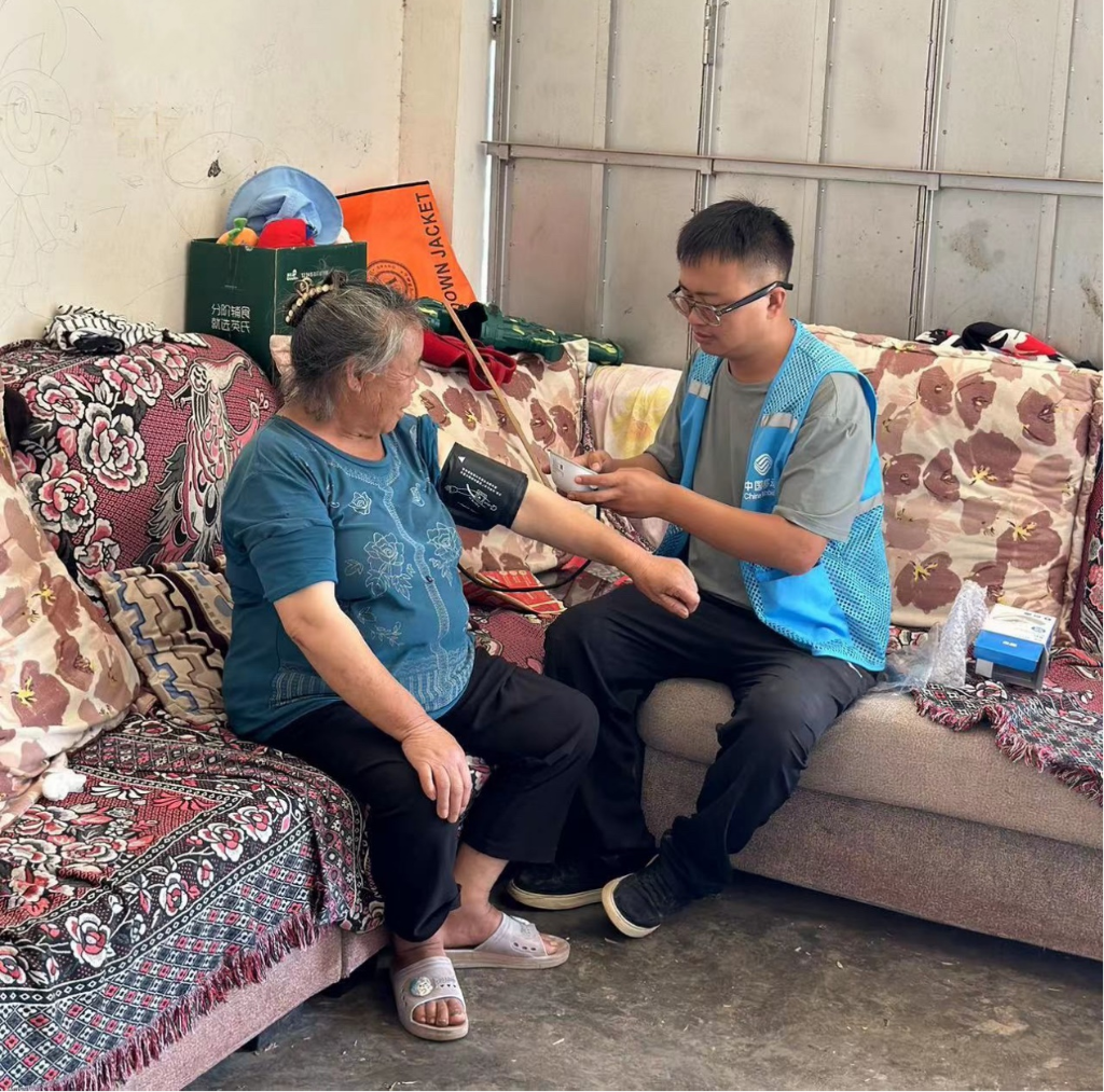云南移動魯甸分公司網格主任馮源國用中國移動電子血壓計為龍頭山客戶測量血壓(2024年8月24日攝)。