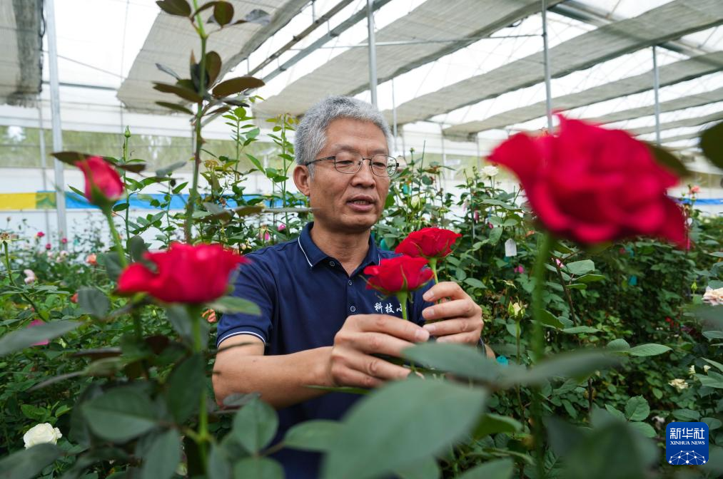 8月23日,中國農業大學教授、中農大-云天化花卉聯合研究中心主任高俊平在云南晉寧花卉產業現代化示范園內查看月季新品種。新華社記者 陳欣波 攝