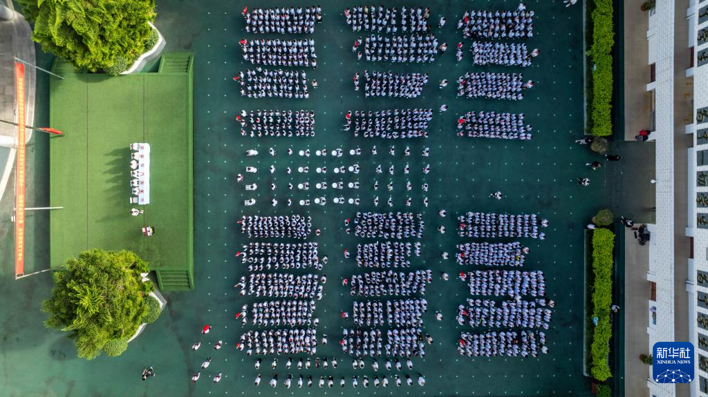 中國-赤道幾內亞友誼小學的師生在參加開學典禮(無人機照片,9月2日攝)。新華社記者 胡超 攝