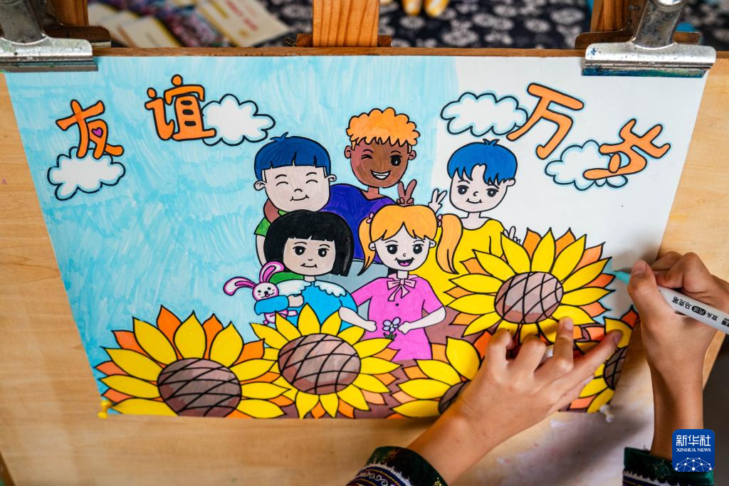 9月2日,在中國-赤道幾內亞友誼小學,一名學生在創作以中赤幾友誼長青為主題的繪畫作品。新華社記者 胡超 攝