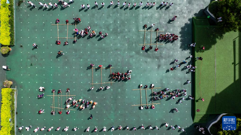 中國-赤道幾內亞友誼小學的學生在操場上跳竹竿舞(無人機照片,9月2日攝)。新華社記者 胡超 攝