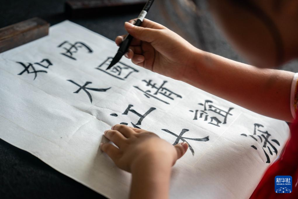 9月2日,在中國-赤道幾內亞友誼小學書法教室,一名學生在創作以中赤幾友誼長青為主題的書法作品。新華社記者 胡超 攝