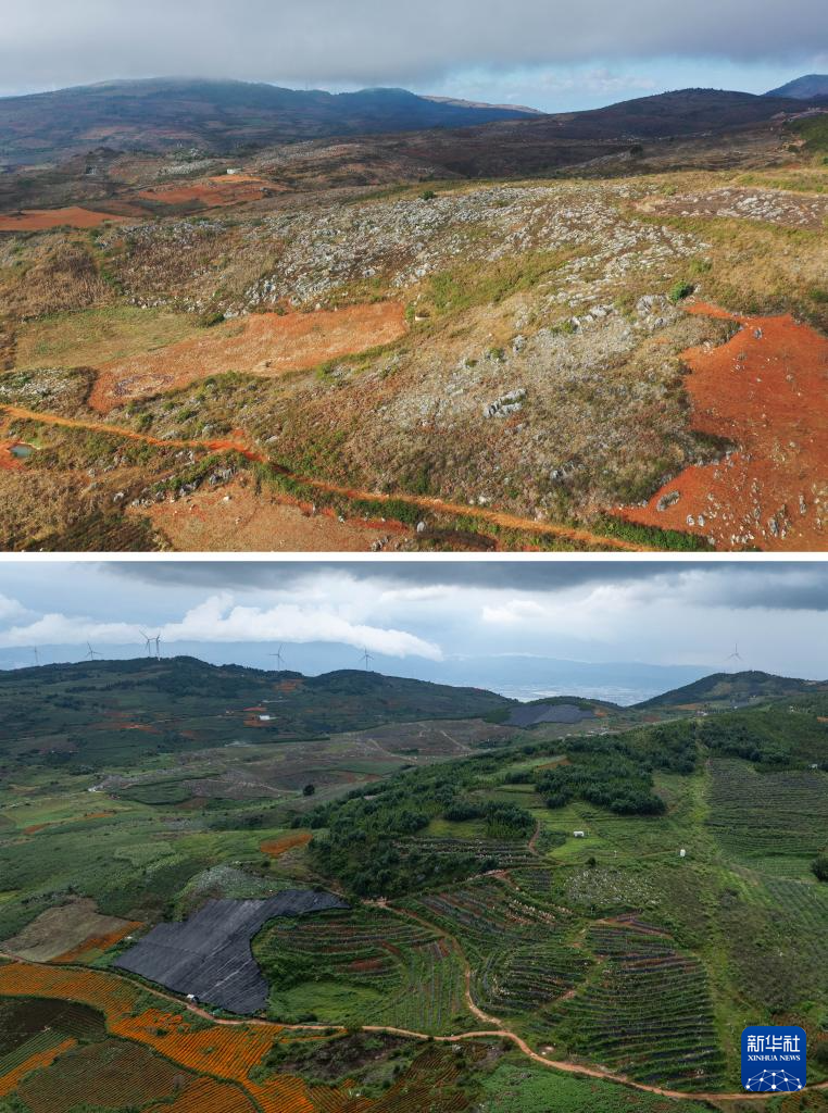 拼版照片,上圖為:2019年1月拍攝的云南省紅河州蒙自市西北勒鄉一景(無人機照片,新華社發);下圖為:2024年9月3日拍攝的云南省紅河州蒙自市西北勒鄉生態修復后的景象(無人機照片,新華社記者胡超攝)。新華社發