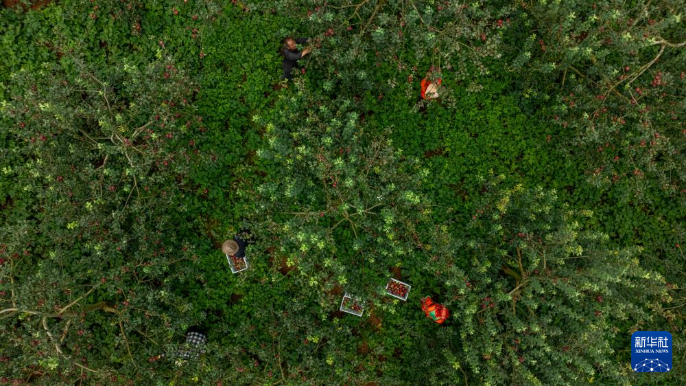 9月3日,云南省紅河州蒙自市西北勒鄉的農戶在采摘蘋果(無人機照片)。新華社記者 胡超 攝