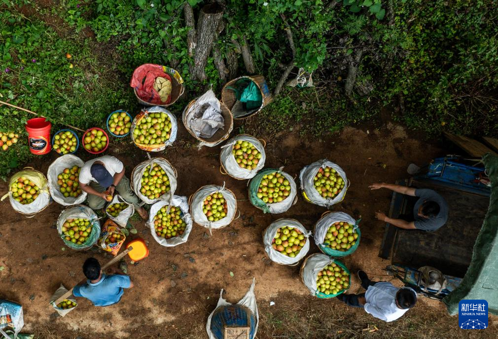 9月5日,紅河州個舊市雞街鎮的果農在分揀魯沙梨(無人機照片)。新華社記者 胡超 攝