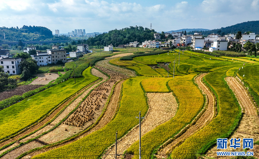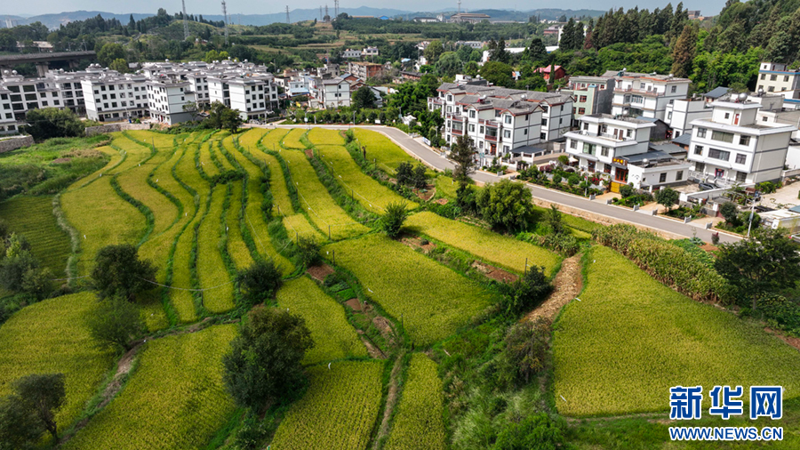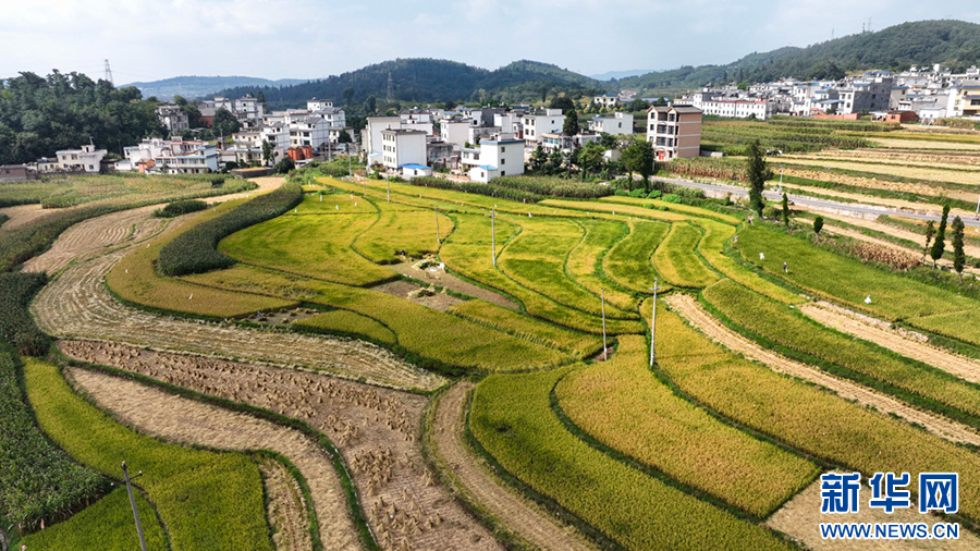 9月4日,云南省曲靖市沾益區天生壩村,梯田與村舍勾勒出一幅優美的田園豐收畫卷。新華網發(孫文來 攝)