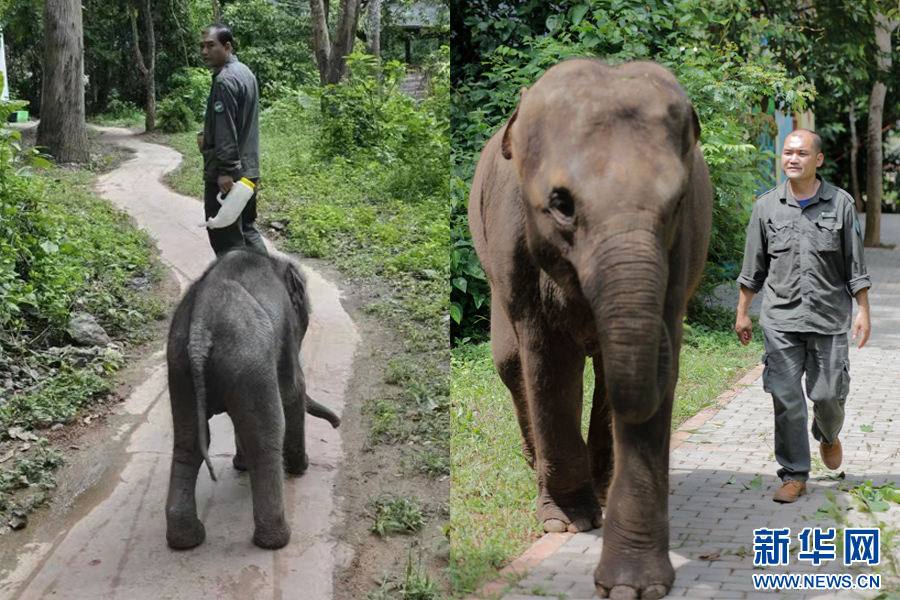 8月1日,“象爸爸”王波(右)和陳繼銘(左)一起照顧羊妞。新華網發 劉云 攝