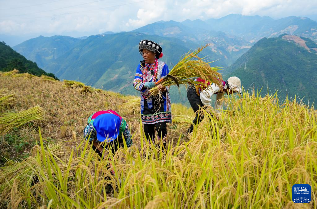 9月24日,怒江州瀘水市大興地鎮自基村村民在旱地優質稻稻田里割稻谷。新華社記者陳欣波 攝