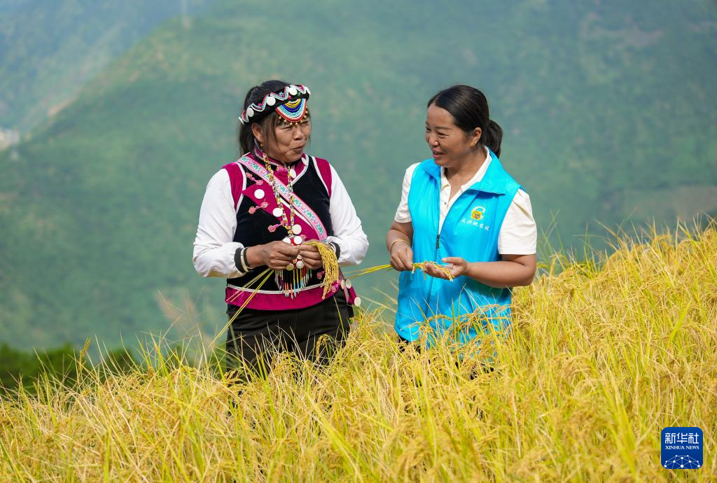 9月24日,怒江州瀘水市大興地鎮自基村一名村民在旱地優質稻稻田里和農藝師楊素桃(右)交流。新華社記者陳欣波 攝