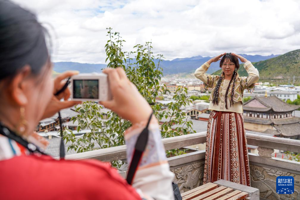 9月27日,游客在獨克宗古城里體驗旅拍。