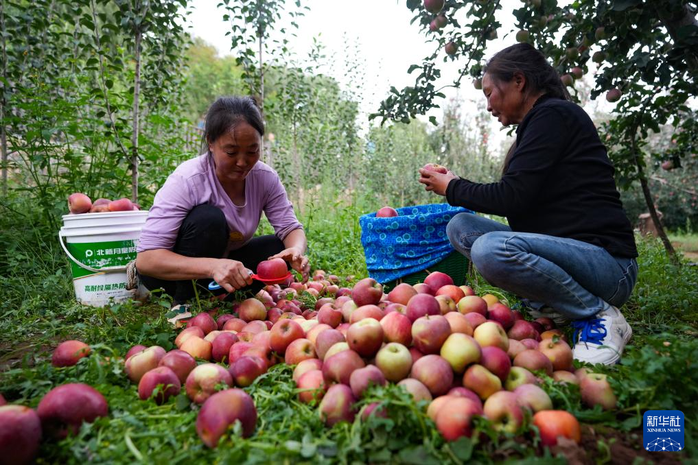 9月29日,在昭通市昭陽區灑漁鎮,兩名當地果農在果園內對剛采摘的蘋果進行初步分級。新華社記者 陳欣波 攝