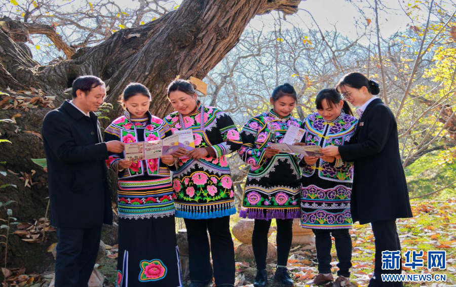 工作人員向彝繡繡娘講解政策(資料圖)。新華網發(云南農信社供圖)