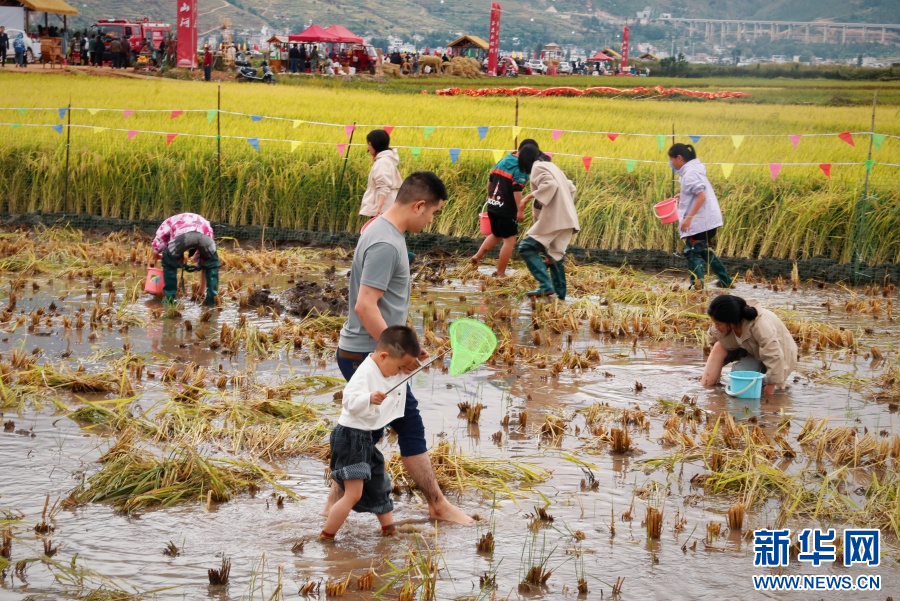 游客和村民體驗稻田捉魚(10月1日攝)。新華網發(楊亦麟 攝)
