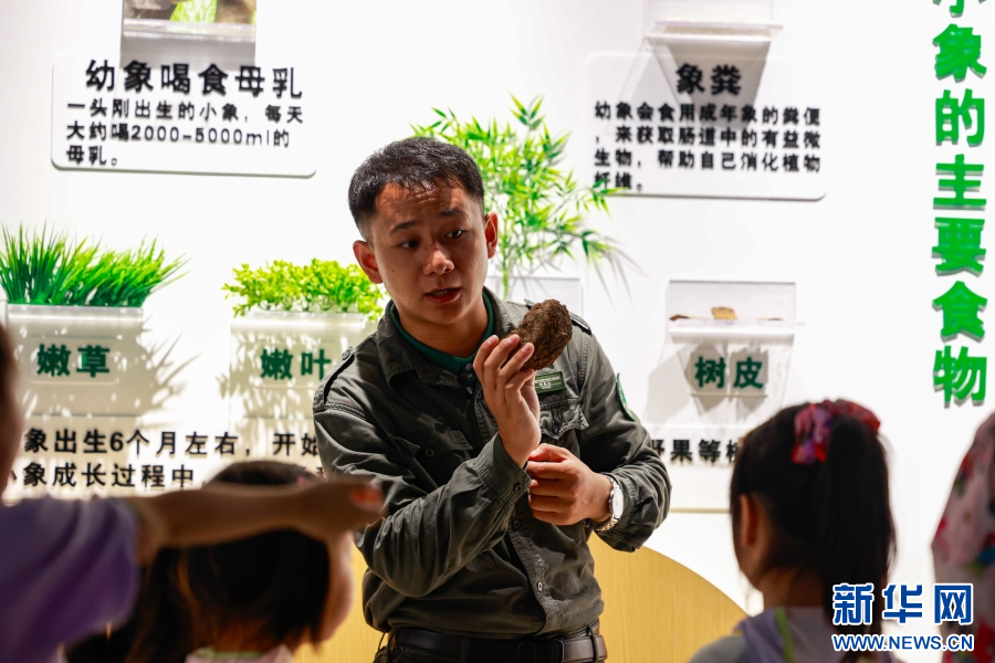 周向國向小朋友們展示象糞樣本并介紹相關知識(7月31日攝)。新華網發 徐華陵 攝