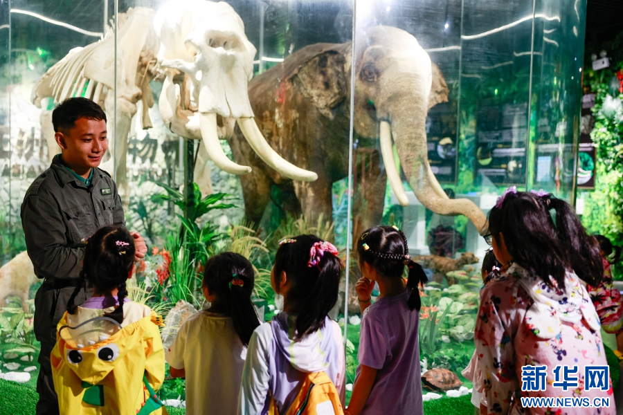 周向國帶領參加研學活動的小朋友們了解亞洲象知識(7月31日攝)。新華網發 劉云 攝