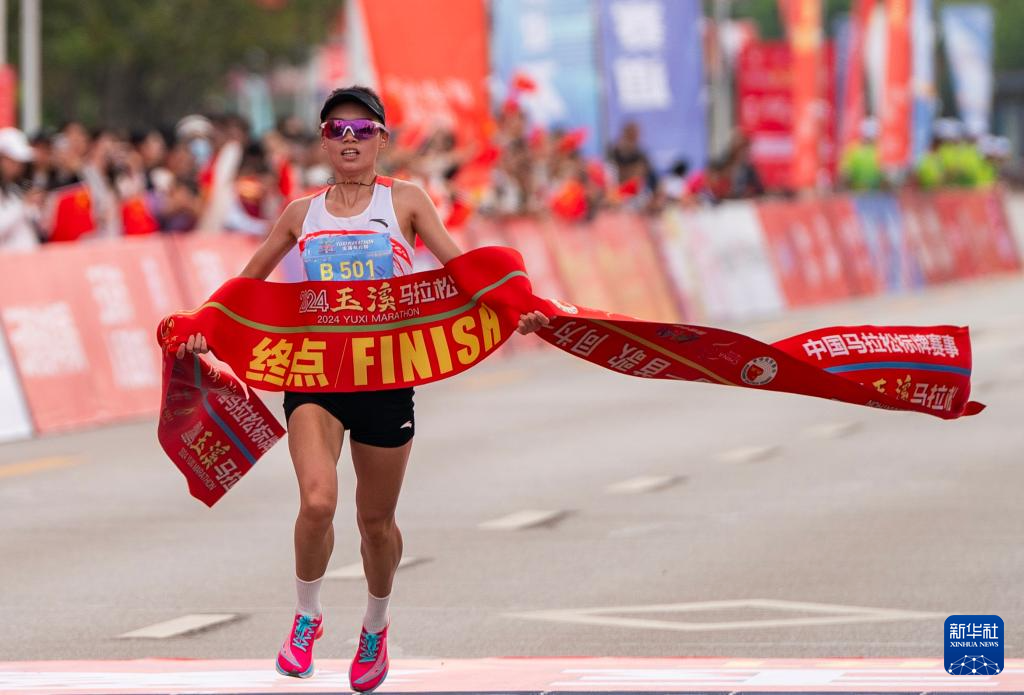 10月5日,選手楊定榮在比賽中沖過終點。最終,她獲得馬拉松女子組冠軍。新華社記者 陳欣波 攝