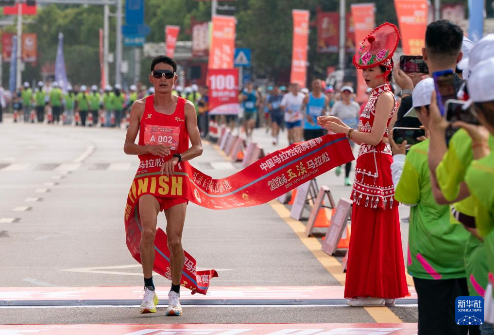 10月5日,選手楊定宏在比賽中沖過終點。最終,他獲得馬拉松男子組冠軍。新華社記者 陳欣波 攝