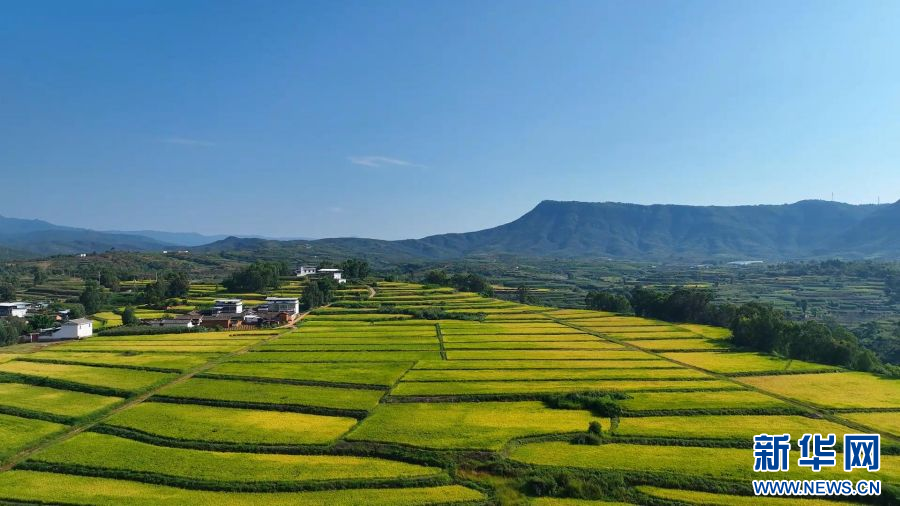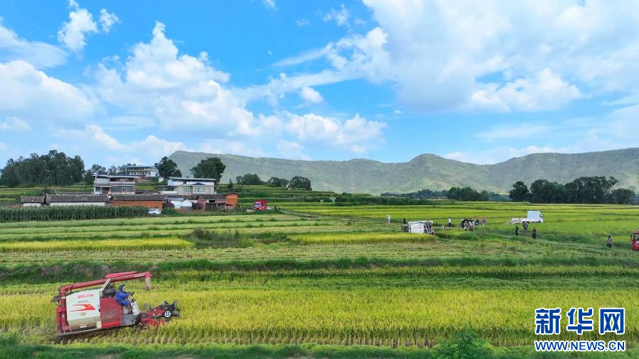 近日,云南省楚雄彝族自治州永仁縣猛虎鄉“幸福里”水稻基地的水稻喜獲豐收,種植戶們搶抓晴好天氣,收割水稻,田間一派忙碌景象。