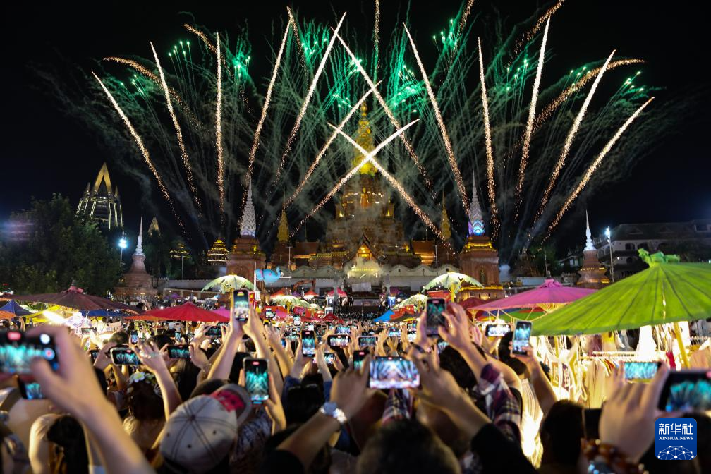 10月4日,游客在云南省西雙版納傣族自治州景洪市告莊西雙景景區觀賞國慶煙花秀。新華社發(李云生 攝)