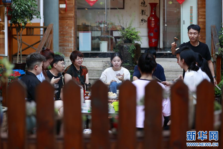 悅萊居客棧老板婁正一(右一)和游客們(資料圖)。新華網 趙普凡 攝