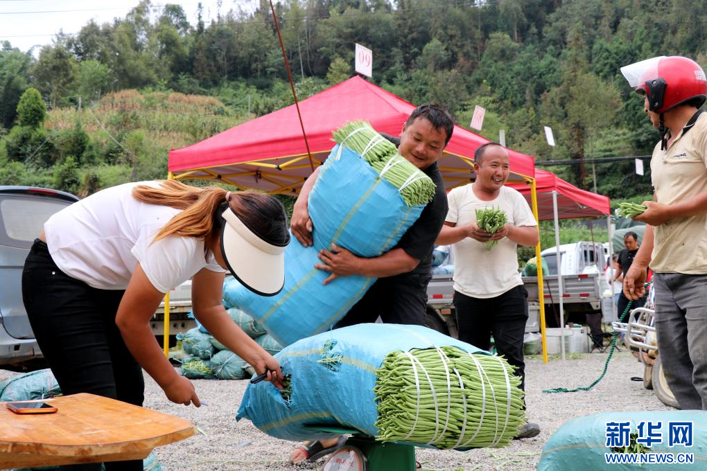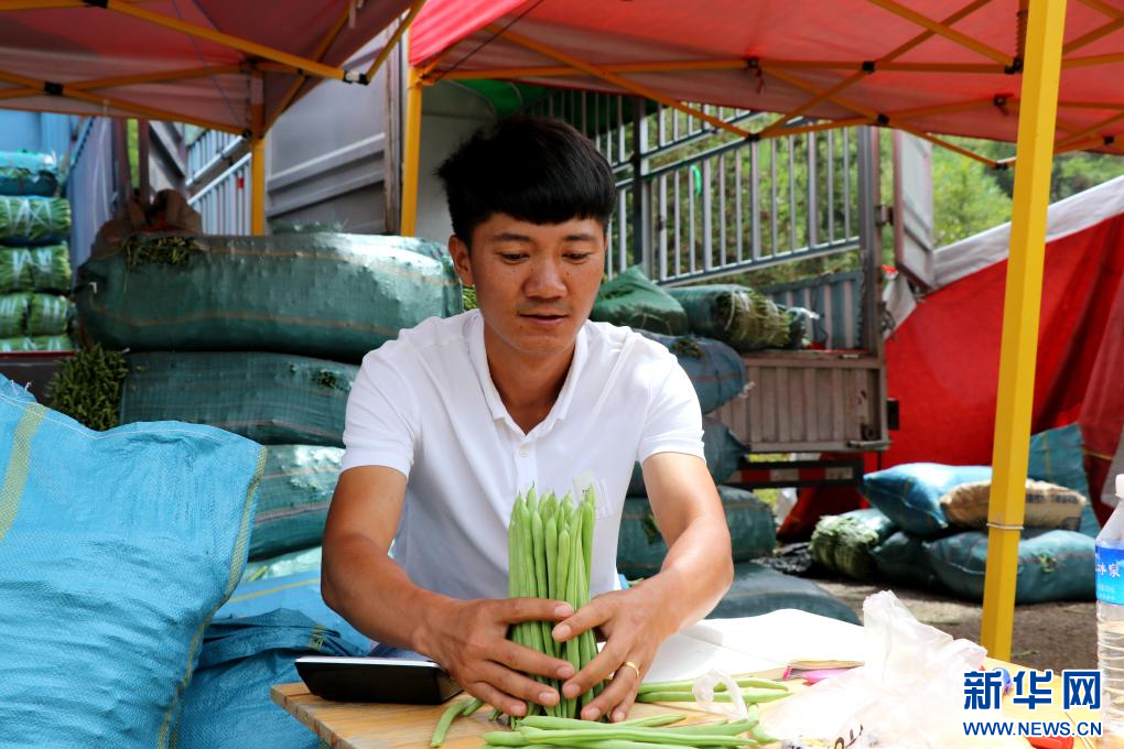 這是村民楊明志(左二)正在賣豆。新華網發(徐靜 攝)