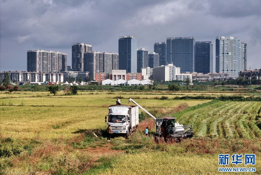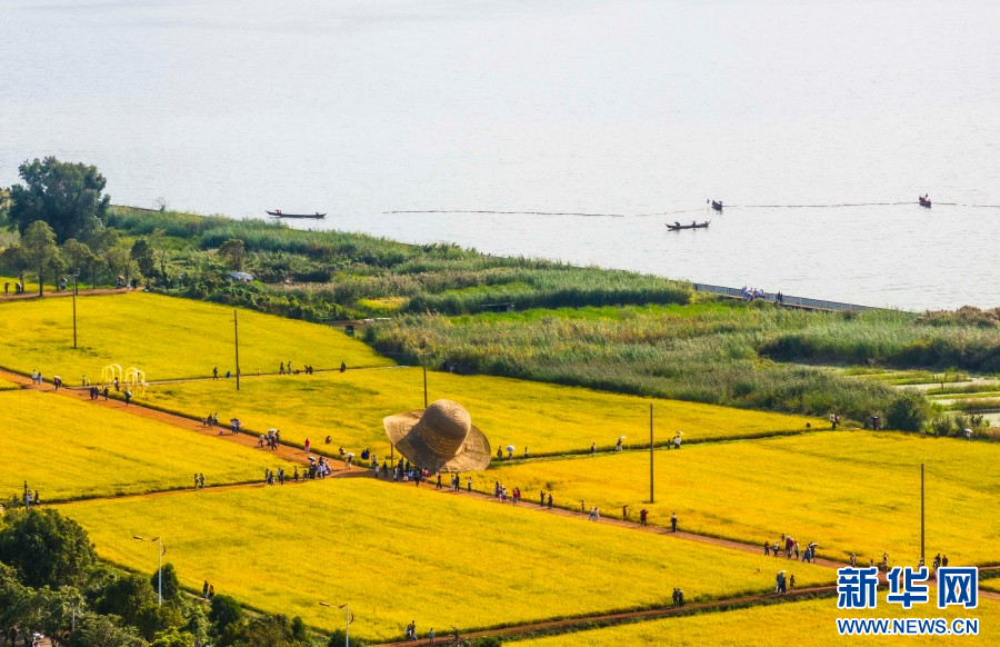近日,云南省昆明市官渡區六甲街道福保社區千畝稻田迎來豐收。成熟的谷穗在陽光下閃耀著金色的光芒,微風拂過,稻田泛起層層波浪。(完)(周旭)