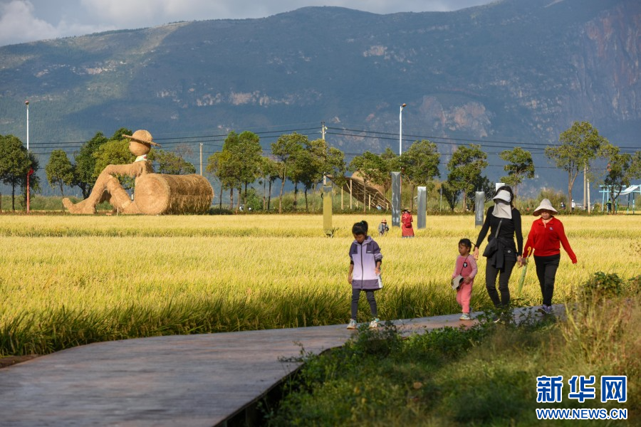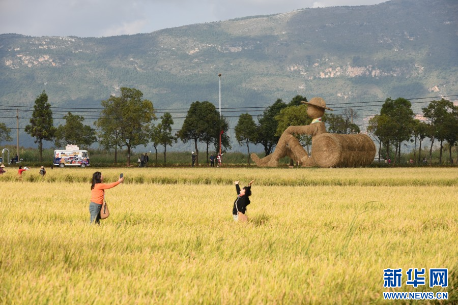 游客來到福保社區稻田中打卡拍照(10月14日攝)。新華網發(王正鵬 攝)