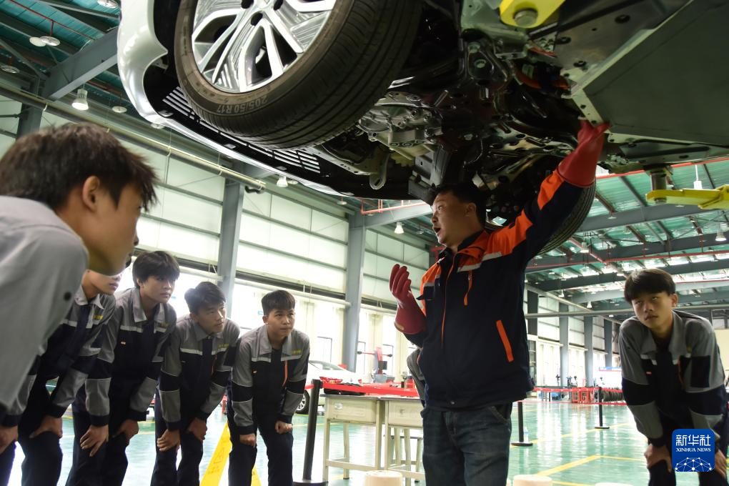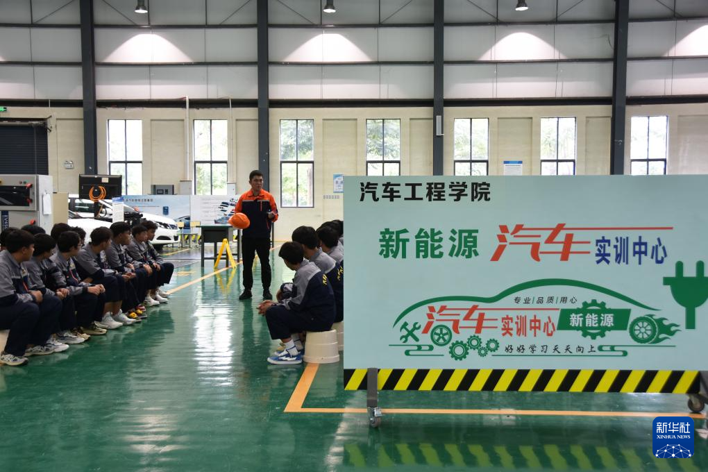 10月23日,在紅河職業技術學院汽車工程技術實訓中心的新能源汽修實訓區域,教師給學生講解新能源汽車維修知識。新華社發(薛瑩瑩 攝)