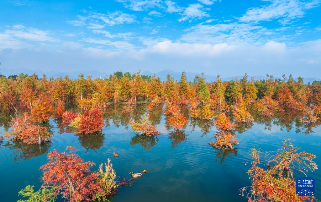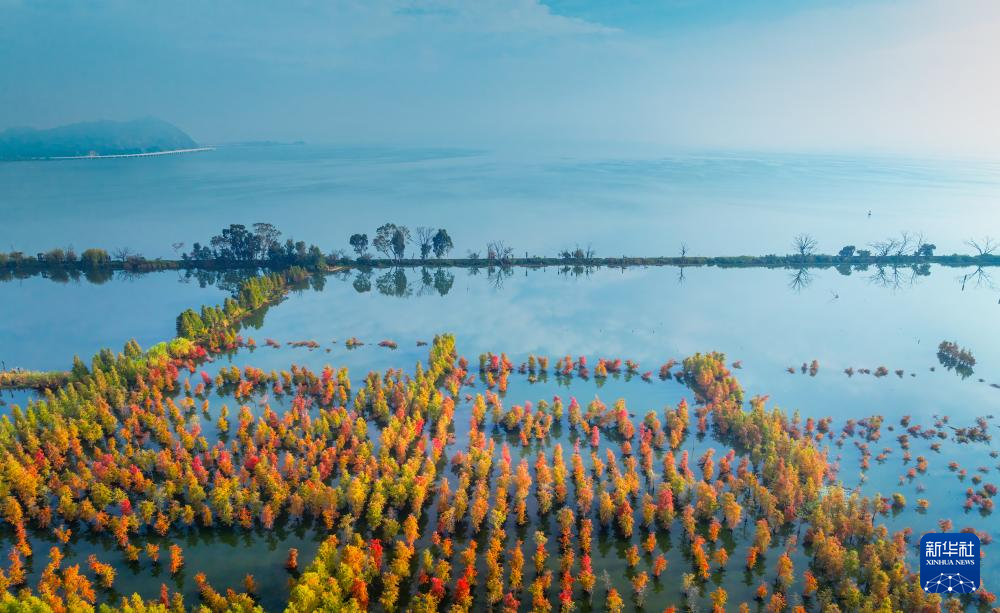 深秋時節,位于云南晉寧的南滇池國家濕地公園,在秋日的朝陽下,連片的水杉林與靜謐的湖水相映成趣,似一幅絢麗的水彩畫,將秋天的韻律美好呈現。